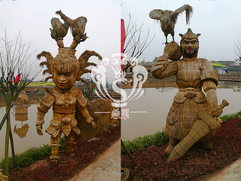現在的精致稻草人藝術通常是由專業美術老師的造型放樣,然后由焊工師傅焊接出立體造型造型,然后以稻草或者稻草繩為材料編捆制作而成。