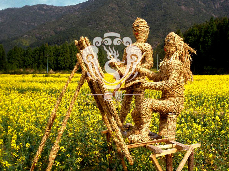 現在的精致稻草人藝術通常是由專業美術老師的造型放樣,然后由焊工師傅焊接出立體造型造型,然后以稻草或者稻草繩為材料編捆制作而成。
