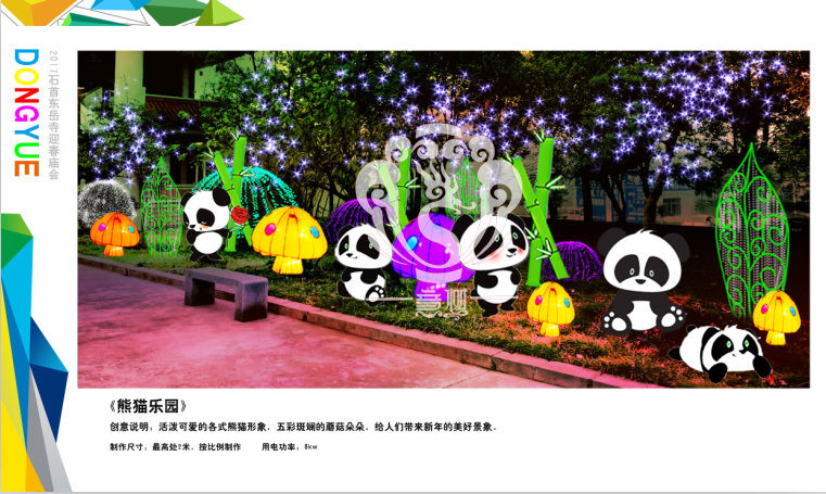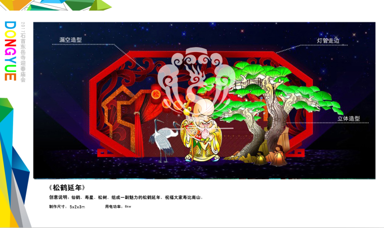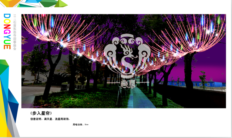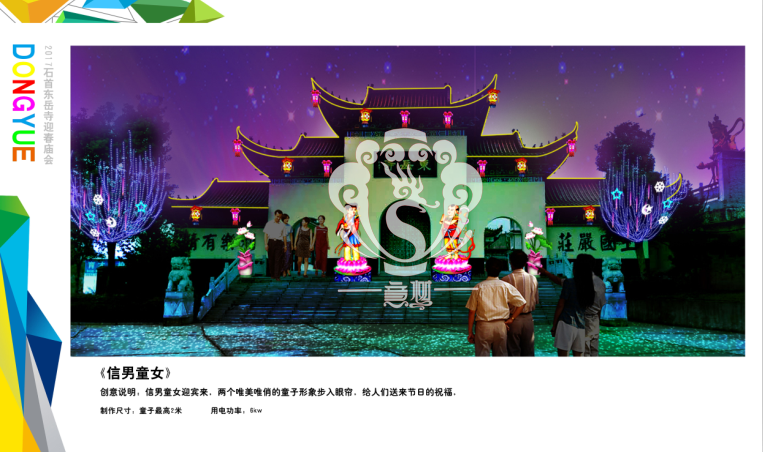 滿懷喜悅,深感榮幸。自貢市意樹文化傳播有限公司通過對湖北荊州石首東岳寺的實地考察,和我們的不懈努力,《湖北荊州石首東岳寺首屆迎春燈會方案》設計工作圓滿完成。我們結合東岳寺特色及氛圍營造亮化區(qū)域地形地貌,緊抓“歡慶佳節(jié)”的設計主題,把迎春燈會精心打造成2017年迎春的亮點,獻上盛大的視覺歡樂盛宴!