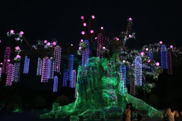 這50余組彩燈位于電影主題娛樂園——長影世紀城內,融合“大唐華章”、玫瑰園、天鵝湖、鮮花廊橋等中西方經典元素,在35萬平方米的范圍內營造出一幅“火樹銀花不夜天”的迷人景象,令賞燈市民流連忘返。