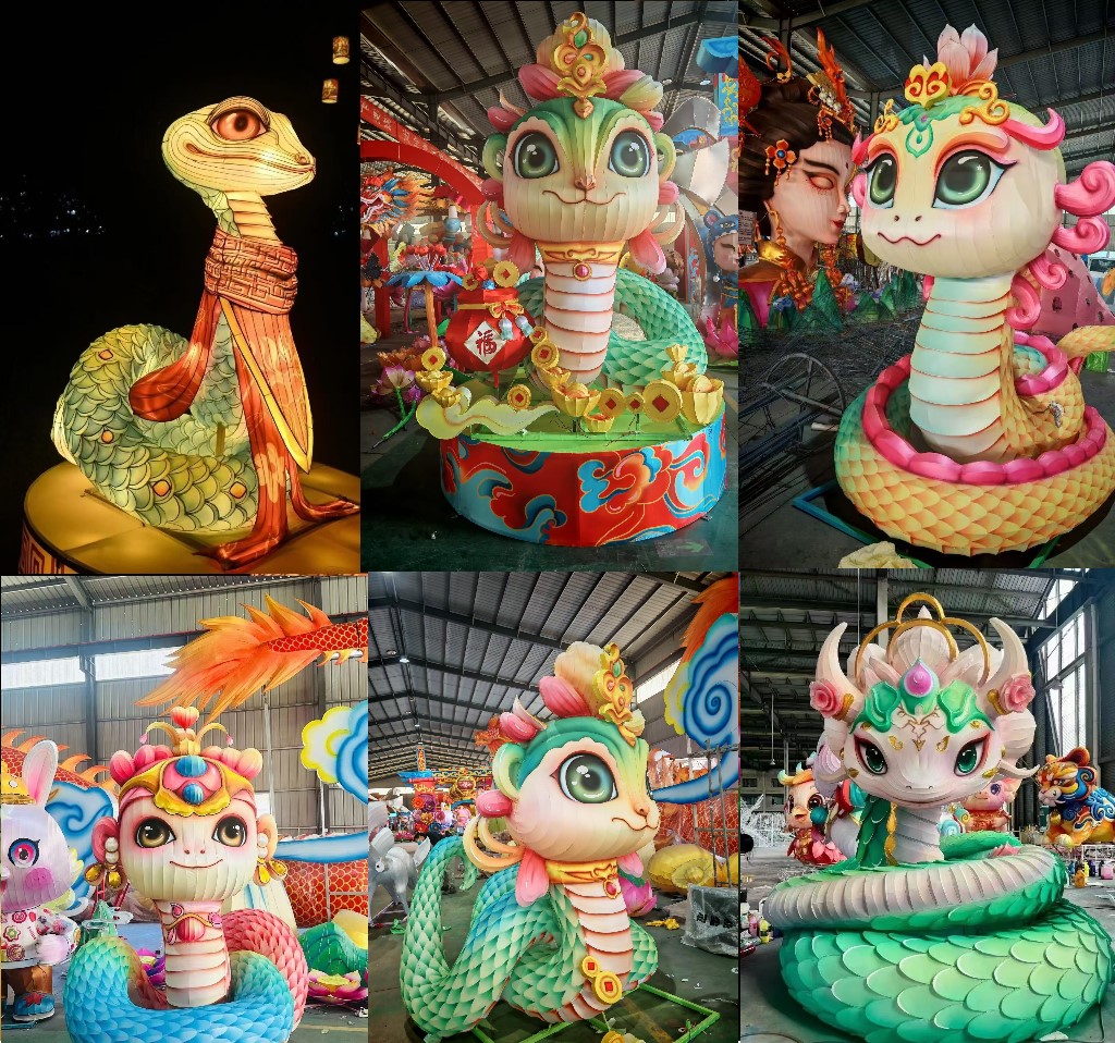 走近細看,自貢彩燈制作的工藝精湛絕倫。每一片鱗片都經(jīng)過精心雕琢,色彩斑斕,或金黃閃耀,寓意著財富與榮耀;或翠綠欲滴,象征著生機與希望。彩燈上還裝飾著各種精美的圖案,有盛開的花朵,寓意著繁榮昌盛;有飛舞的蝴蝶,代表著幸福與美好。這些圖案與蛇的形象完美融合,展現(xiàn)出了獨特的藝術(shù)魅力。