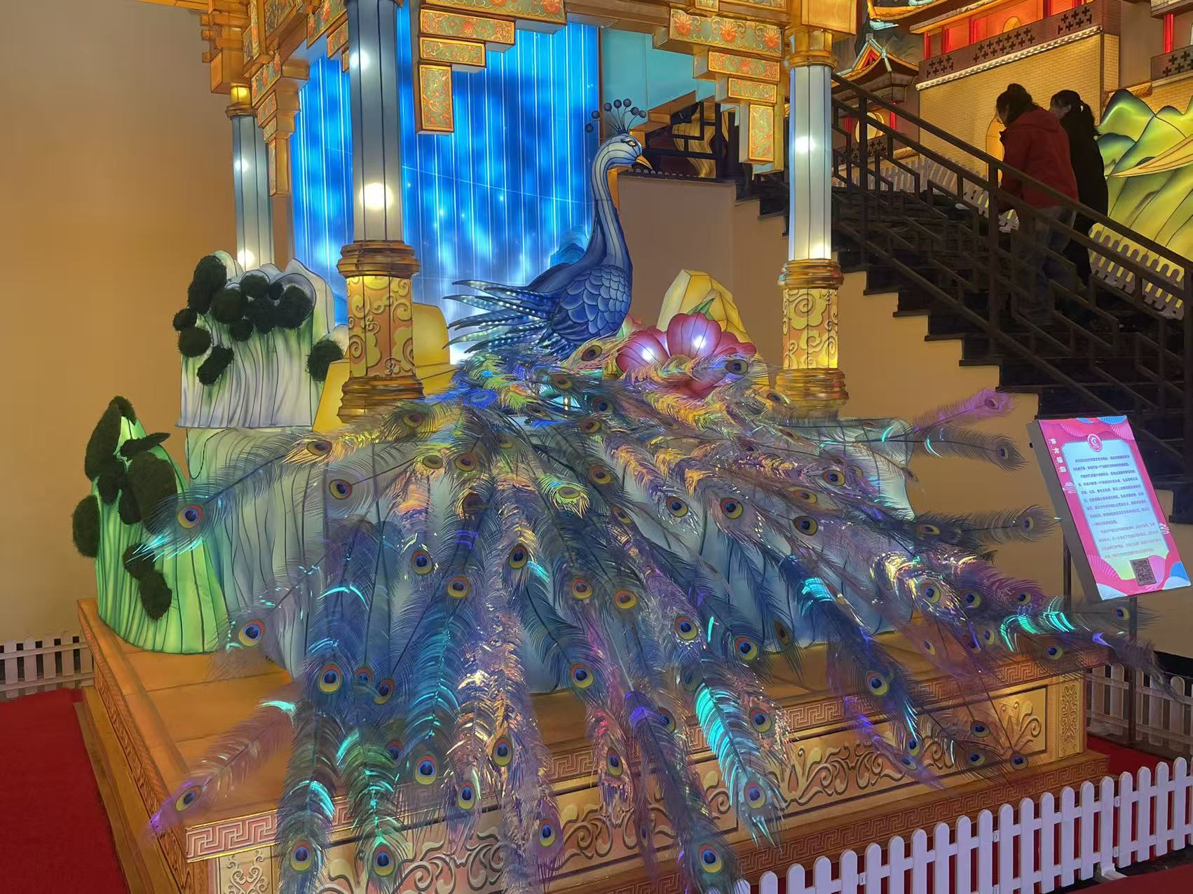 自貢彩燈素有 “天下第一燈” 美譽,其工藝歷經千年淬煉,從漢代井鹽開采時期的雛形,到明清 “獅燈場市” 的興盛,如今已發展出立體絲扎、分色裱糊、瓷器捆扎等數十種核心技法。意樹文化團隊深諳此道,在創作中既堅守 “美工放樣、鉗工造型、焊工固定、裱糊上色” 的傳統工序,又融入 LED 節能光源、AI 互動等現代科技,更創新性運用特色材料,讓每盞花燈都成為技藝傳承的載體。如工匠們將以 45 度角精準裁切按紋理緊密粘制成孔雀翎羽,燈光透過的天然紋路,盡顯生靈的靈動質感。