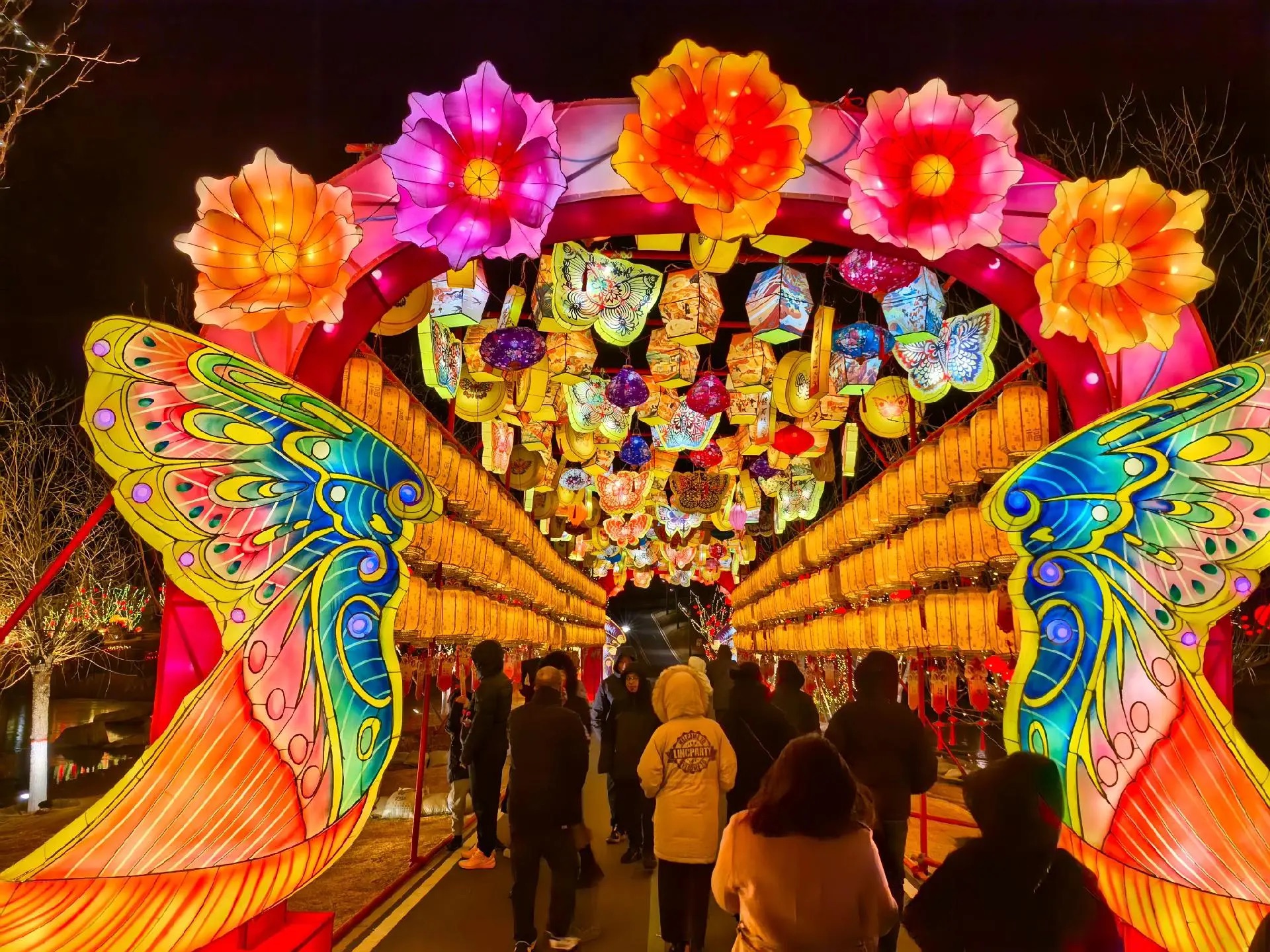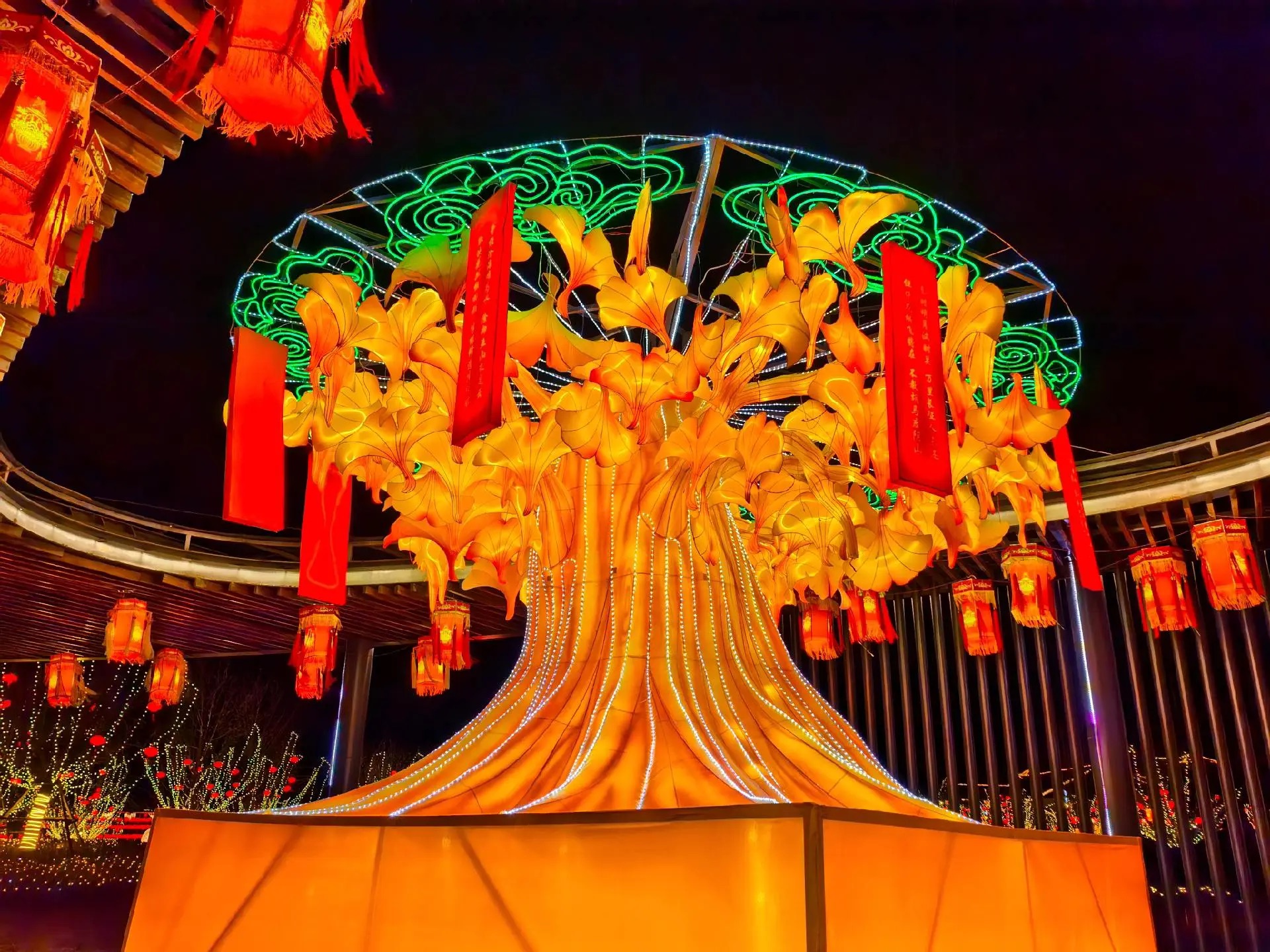 燈展現(xiàn)場,千燈萬盞與龍馬湖的山、水、橋景相映成趣,構(gòu)筑成一幅絕美的新春光影畫卷。高達十二米的“富貴平安”燈組喜慶洋溢,五顏六色的牡丹花團錦簇,成為全場焦點;