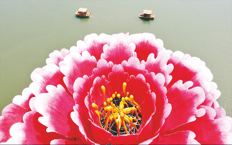 4月16日,河南省洛陽市隋唐城遺址植物園滴翠湖,一朵直徑36米,高13米的巨型牡丹造型亮相,吸引游客紛紛前來打卡。據介紹,這朵巨型牡丹“培育”歷時30天,花型以洛陽本土牡丹“洛陽紅”為參考,內部有燈光裝置,可供游客晚上觀賞。