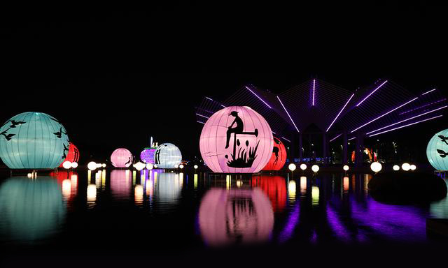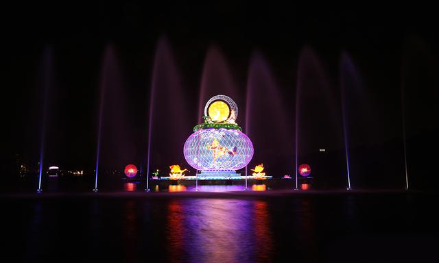 "水月鳳凰"觀賞臺附近湖面,一組以圓月為設(shè)計元素,繽紛色彩搭配的彩燈展現(xiàn)美態(tài)。在燈光的作用下,彩燈投影出戀人的剪影,一個個相依的身影,唯美浪漫。