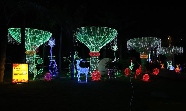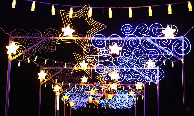公園的通道之上,掛著"星辰"。星星、云朵造型的彩燈亮起來,一閃一閃,仿似夜空中閃爍的星,與家人、愛人攜手漫步,唯美,溫馨,而又浪漫。
